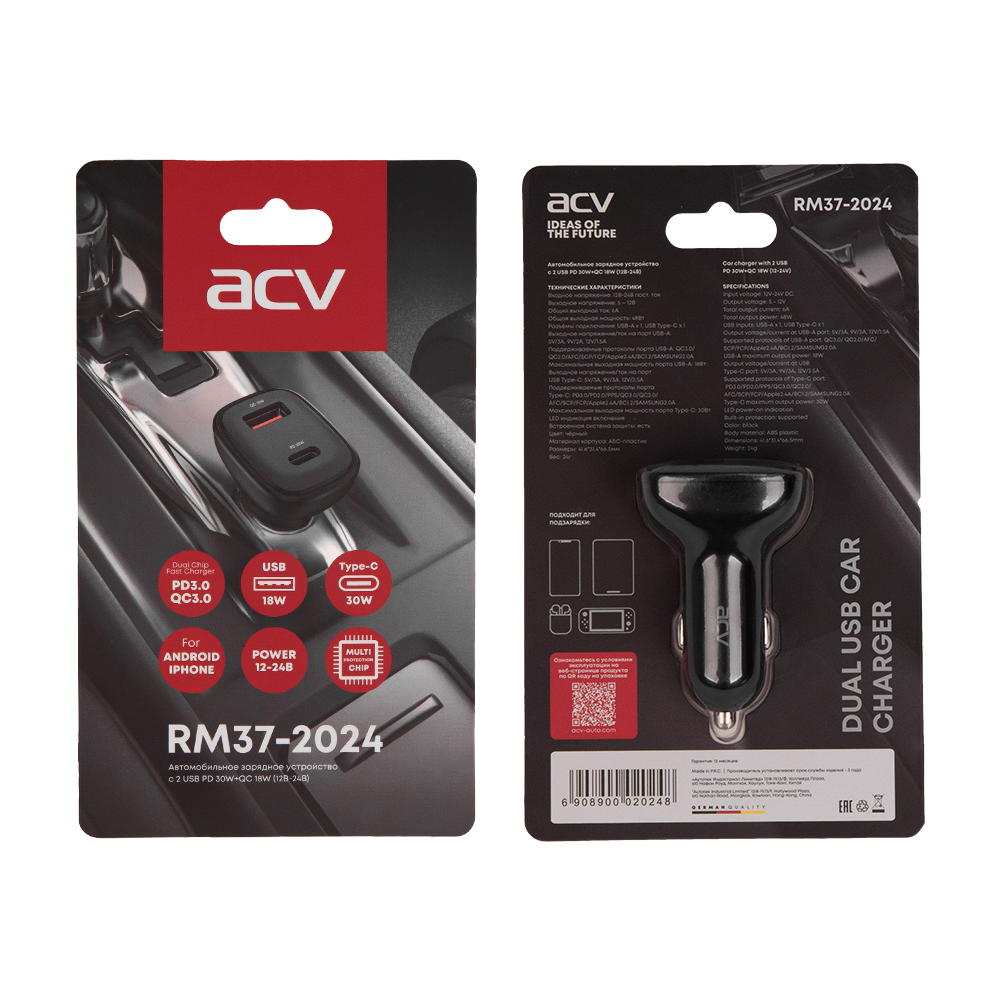Автомобильное зарядное устройство c 2 USB PD 30W/QC 18W (12В-24В)
